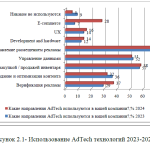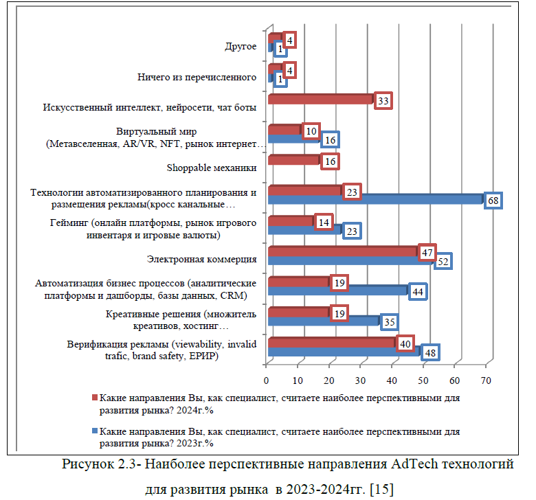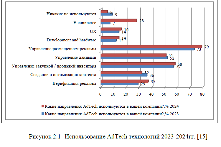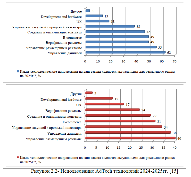 Итак, выше была рассмотрена текущая ситуация и перспективы развития AdTech технологий в 2025г. Наиболее востребованными является искусственный интеллект и иные цифровые технологии, которые формируют рекламный рынок. В связи с наличием проблемы кадрового голода, в том числе и в рекламном бизнесе, внедрение искусственного интеллекта в деятельность рекламного отдела или рекламного агентства является наиболее актуальной. Для того, чтобы подробнее описать инновационные технологии, перейдем к следующему параграфу курсовой работы.