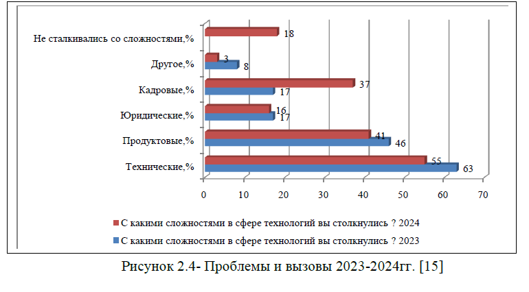 Другими значимыми проблемами являются технические и продуктовые трудности – их отметили 55,0% и 41,0% опрошенных. Однако доля респондентов, заявивших о подобных сложностях, уменьшилась – на 8,0% и 5,0% соответственно. 16,0% компаний столкнулись с юридическими проблемами. Только 18,0% участников исследования не испытывали трудностей в сфере технологий в 2024 году, рисунок 2.4.
