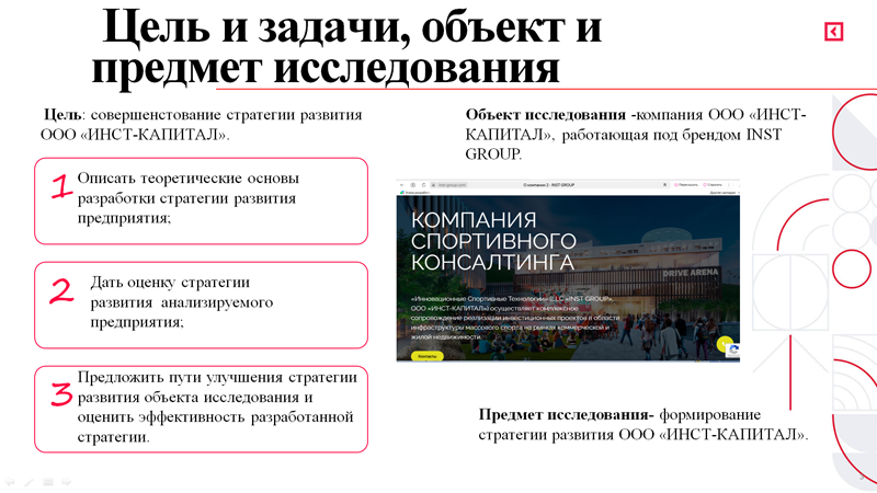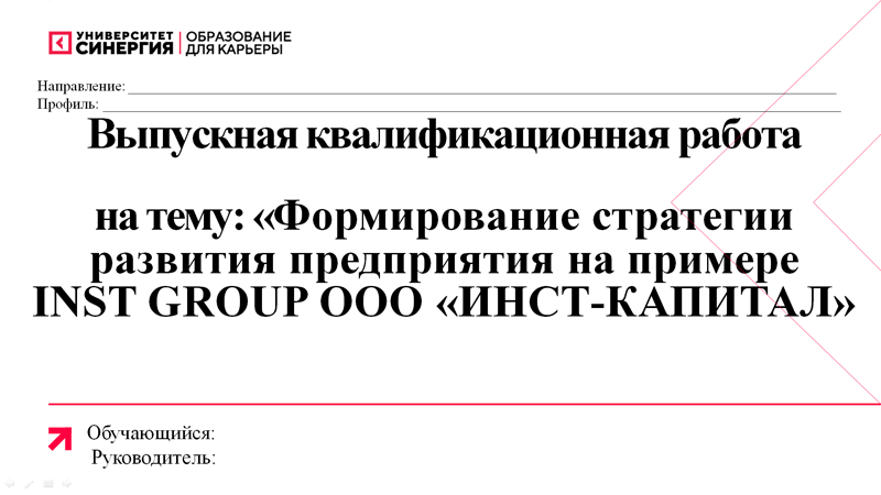 Объектом исследования является компания ООО «ИНСТ-КАПИТАЛ», работающая под брендом INST GROUP. Предмет исследования-формирование стратегии развития ООО «ИНСТ-КАПИТАЛ».