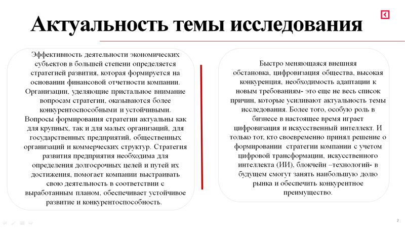 Быстро меняющаяся внешняя обстановка, цифровизация общества, высокая конкуренция, необходимость адаптации к новым требованиям- это еще не весь список причин, которые усиливают актуальность темы исследования. Более того, особую роль в бизнесе в настоящее время играет цифровизация и искусственный интеллект. И только тот, кто своевременно принял решение о формировании стратегии компании с учетом цифровой трансформации, искусственного интеллекта (ИИ), блокчейн –технологий- в будущем смогут занять наибольшую долю рынка и обеспечить конкурентное преимущество.