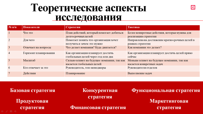 Стратегия определяет направление развития компании на несколько лет вперед, поэтому она ориентирована на долгосрочную перспективу. Стратегические планы формируют видение будущего. Тактика связана с конкретными действиями и направлена на реализацию бизнес-стратегии здесь и сейчас. Наиболее популярными видами стратегий развития предприятия являются: базовая, конкурентная, функциональная, продуктовая, финансовая, маркетинговая. Разработка стратегии развития организации осуществляется на основании нескольких этапов: анализ текущего состояния; анализ внешней среды; анализ внутренних ресурсов; выбор стратегии; реализация и контроль.
