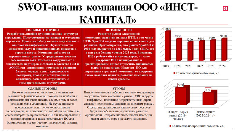 Внешняя и внутренняя среда компании ООО «ИНСТ-КАПИТАЛ» создает как возможности, так и угрозы. Тем не менее рынок, на котором работает компания является перспективным, наблюдается рост спроса на спортивные услуги и спортивные объекты. Основными трендами в сегменте спортивных объектов являются следующие: спортивные объекты стали важной частью инфраструктуры, новые объекты в небольших городах будут открываться при поддержке государства, фитнес-операторы сотрудничают с девелоперами, растёт спрос на уличные спортивные зоны, прогнозируется рост цен и расширение рынка.
