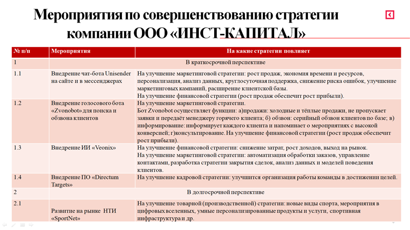 Мероприятия по совершенствованию стратегии компании ООО «ИНСТ-КАПИТАЛ» (слайд 8)