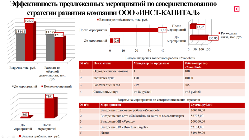 Предложенные мероприятия положительно повлияют на маркетинговую, финансовую, конкурентную и стратегию управления персоналом. Общая сумма затрат на все мероприятия проекта составит 519659,0 рублей, сюда входят затраты на приобретение голосового робота «Zvonobot», чат-бота «Unisender», покупка ИИ «Veonix», ПО Directum Targets.