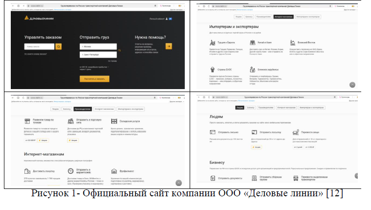 Компания ООО «Деловые линии» работает в сфере оказания логистических услуг более 20 лет. Юридический адрес: 196210, Санкт-Петербург г, Стартовая улица, дом № 8, литера А, офис 132. Основными видами услуг является: доставка сборных грузов, комплексная логистика для бизнеса, перевозка выделенным транспортом, страхование при перевозке, упаковка. Свою деятельность компания осуществляет на рынке электронной коммерции, для этого имеется интернет-сайт, рисунок 1.