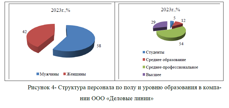 Это на 1,59% ниже уровня начала анализируемого периода и на 0,53% меньше уровня прошлого года. Наибольший удельный вес в структуре приходится на рабочих и по данным на 2023г. их доля составила 54.0%. Небольшую долю занимают руководители и специалисты, по данным на конец анализируемого периода доля этих сотрудников составила 12,0% и 16,0% соответственно. Немногим больше приходится на служащих-18,0%, рисунок 3. По гендерному признаку наибольший удельный вес занимают мужчины, их доля составляет 58,0%, 42,%- занимают женщины, рисунок 4.