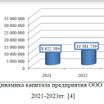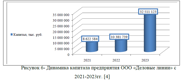 Несмотря на снижение численности, финансовые показатели идут вверх (Приложение 2). По данным на 2023г. капитал предприятия сформировался на уровне 32511123,0 тыс. руб., это на 213,15% больше, чем годом ранее и на 277,05% превышает показатель начала анализируемого периода, рисунок 6.
