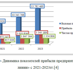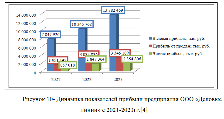 Существенно увеличилась валовая прибыль, по сравнению с началом анализируемого периода ее рост составил 75,61% и в стоимостном выражении показатель сформировался в сумме 13782469,0 тыс. руб. В два раза увеличилась прибыль от продаж и чистая прибыль, по данным на 2023г. эти показатели составили 3345189,0 тыс. руб. и 2354806,0 тыс. руб. соответственно, рисунок 10.