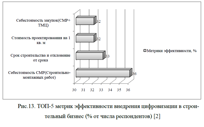 Основными метриками эффективности внедрения цифровизации в строи-тельный бизнес являются: себестоимость СМР, сроки строительства, стоимость проектирования, себестоимость закупок, рисунок 13.
