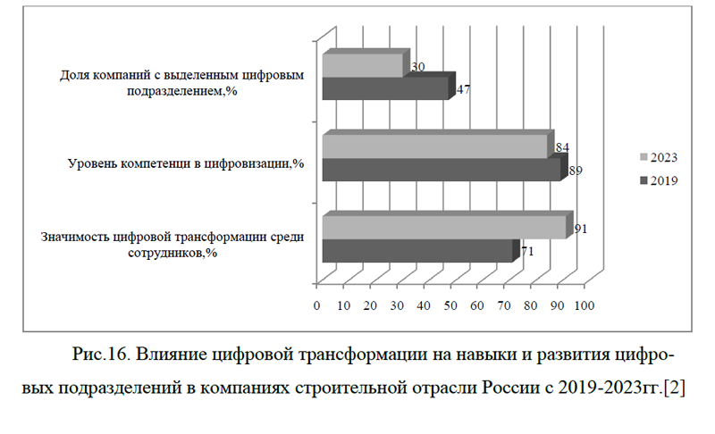 Значимость цифровой трансформации строительной отрасли на протяжении 2019-2023гг. растет и на конец анализируемого периода показатель вырос на 20,0%, его значение сформировалось на уровне 91,0%, рисунок 16.