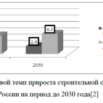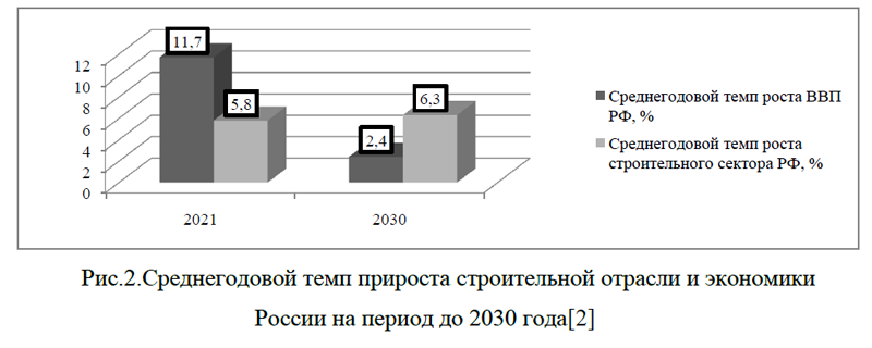 При этом прогнозируется среднегодовой темп роста ВВП РФ на период с 2023 по 2030гг. на уровне 2,4%,тогда как среднегодовой темп роста строительной отрасли к 2030 году составит 6,3%, рисунок 2.