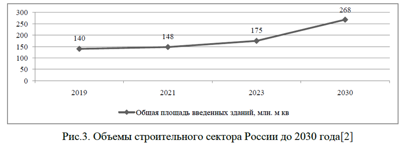 Общие объемы строительного сектора в 2030 году сформируются на уровне 268,0 млн. кв. м., это на 53,14% больше, чем 2023 году и на 91,43% превышает значение показателя 2019 года, рисунок 3.