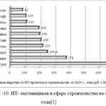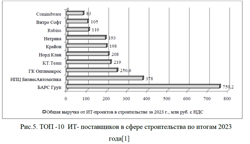 При этом, крупнейшими ИТ-поставщиками в сфере строительства в 2023 году (по объемам выручке от реализации ИТ-проектов в этой области) стали компании: БАРС Груп, НПЦ БизнесАвтоматика, ГК Оптимакрос, KT.Team, Норд Клан, Крайон, Comindware, Нетрика, Rubius, Витро Софт, рисунок 5.