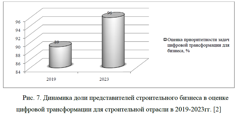 Представители строительного бизнеса отмечают, что цифровизация дает ощутимый эффект. Доля представителей бизнеса, которые высокого оценивают цифровую трансформацию отрасли в 2019 году составила 89,0%, к 2023 году их доля увеличилась на 7,0% и составила 96,0%, рисунок 7.