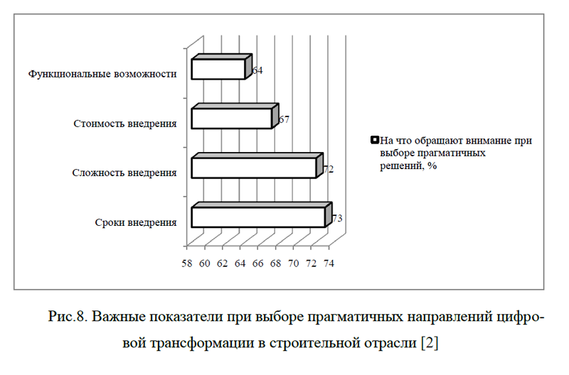 Наиболее популярные выборочные инновационные решения, которые внедряются в строительную отрасль: искусственный интеллект (ИИ) и машинное обучение, дроны, виртуальная и реальная реальность, облачные технологии, блокчейн- технологии и другие. При выборе различных прагматичных направлений цифровизации в строительной отрасли, респонденты обращают внимание на сроки внедрения, стоимость внедрения, сложность внедрения и функциональные возможности. Так, 72-73,0% респондентов волнуют сложность и сроки внедрения, 67,0%- беспокоит стоимость внедрения, для 64,0% респондентов важным является функциональные возможности цифрового продукта, рисунок 8.