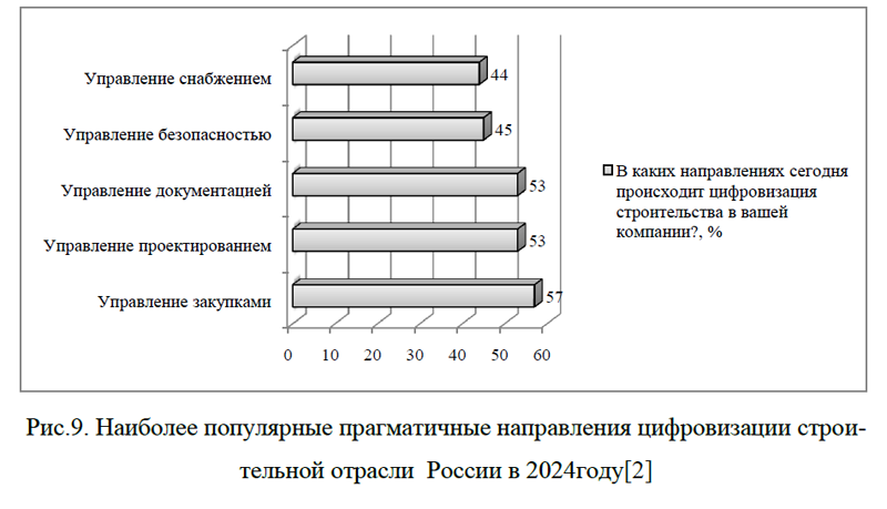 Большую популярность среди прагматичных направлений цифровизации строительной отрасли в России получили: управление закупками(57,0%), управление проектированием (53,0%) и документацией (53,0%). Также в 2024 году строительный бизнес оцифровывал: управление безопасностью и снабже-нием, рисунок 9.