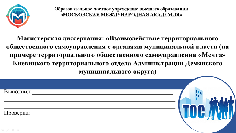 Уважаемые члены комиссии! Вашему вниманию предлагается доклад к магистерской диссертации на тему: Взаимодействие территориального общественного самоуправления с органами муниципальной власти (на примере территориального общественного самоуправления «Мечта» Кневицкого территориального отдела Администрации Демянского муниципального округа) (слайд 1)