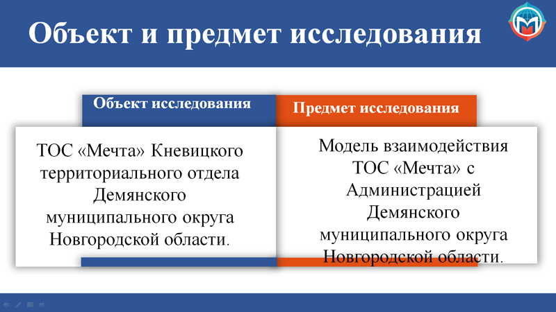 Объектом исследования является ТОС «Мечта» Кневицкого территориального отдела Демянского муниципального округа Новгородской области. Предмет исследования – модель взаимодействия ТОС «Мечта» с Администрацией Демянского муниципального округа Новгородской области.