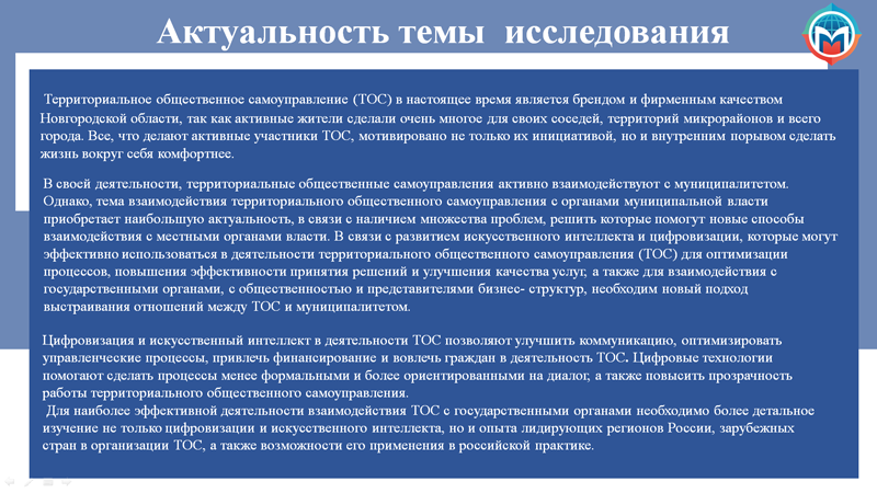 Для наиболее эффективной деятельности взаимодействия ТОС с государственными органами необходимо более детальное изучение не только цифровизации и искусственного интеллекта, но и опыта лидирующих регионов России, зарубежных стран в организации ТОС, а также возможности его применения в российской практике.
