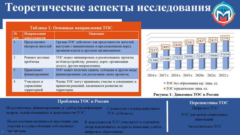 Для определения наиболее перспективных направлений развития ТОС в России был изучен зарубежный опыт, который позволил сформировать лучшие модели развития: «Цифровое ТОС», «ТОС как центр социальных инноваций», «Экологическое ТОС». Однако развитие ТОС стоит формировать именно с цифровой модели. В настоящее время искусственный интеллект и цифровизация получили широкое распространение во взаимодействии ТОС с муниципатитетом. Искусственный интеллект (ИИ) и цифровизация используются в деятельности территориального общественного самоуправления (ТОС) для оптимизации процессов, повышения эффективности принятия решений и улучшения качества услуг. Эти технологии применяются в разных направлениях, например, в работе с обращениями граждан, в аналитической деятельности, в сфере финансов и закупок.