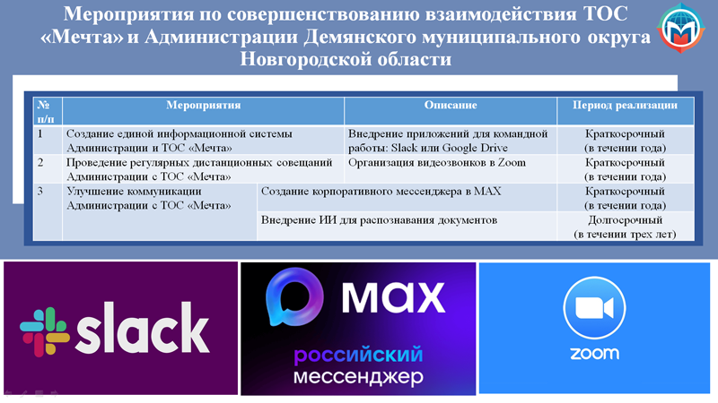 Основной проблемой во взаимодействии ТОС «Мечта» с Администрацией Демянского муниципального округа Новгородской области является- слабая цифровизация. В связи с этим, были предложены мероприятия, которые будут способствовать формированию ТОС «Мечта» по модели развития «Цифровое ТОС».