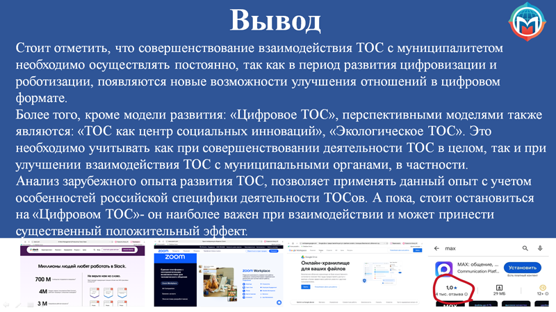 Стоит отметить, что совершенствование взаимодействия ТОС с муниципалитетом необходимо осуществлять постоянно, так как в период развития цифровизации и роботизации, появляются новые возможности улучшения отношений в цифровом формате. Более того, кроме модели развития: «Цифровое ТОС», перспективными моделями также являются: «ТОС как центр социальных инноваций», «Экологическое ТОС». Это необходимо учитывать как при совершенствовании деятельности ТОС в целом, так и при улучшении взаимодействия ТОС с муниципальными органами, в частности. Анализ зарубежного опыта развития ТОС, позволяет применять данный опыт с учетом особенностей российской специфики деятельности ТОСов. А пока, стоит остановиться на «Цифровом ТОС»- он наиболее важен при взаимодействии и может принести существенный положительный эффект.