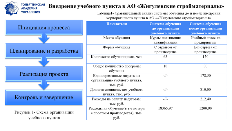 Создание и развитие корпоративного учебного пункта в АО «Жигулевские стройматериалы» будет состоять из нескольких этапов. Они включают инициацию процесса, планирование и разработку, реализацию проекта и контроль. В своей деятельности «Учебный пункт» будет руководствоваться действующим законодательством, приказами (распоряжениями) по обществу и Положением «Об учебном пункте». Основными единовременными затратами на организацию пункта будут являться: расходы на приобретение необходимой мебели, столы, стулья), канцелярских товаров, доска, стоимость пошлины на получение лицензии и прочее. Планируется что учебный пункт будет обучать по 30 направлениям, это в три раза больше, чем было до реализации данного проекта. Основные направления обучения будут включать следующие программы курсов: Строительная испытательная лаборатория; методы оценки прочности и контроля качества цемента, бетона и сухих смесей; Производство строительных материалов, изделий и конструкций; Лабораторные испытания дорожно-строительных материалов; Основы законодательства в строительстве; Строительное материаловедение; Современные технологии возведения зданий; Ценообразование и сметное дело в строительстве; Технологические процессы в строительстве; Управление проектами в строительстве; Городское строительство и хозяйство; Строительство зданий и сооружений; Ценообразование и сметное нормирование в строительстве; Безопасность строительства; Прораб; Строительство зданий и сооружений 1 и 2 уровней ответственности; Техническая защита информации ограниченного доступа; Промышленное и гражданское строительство; «Специалист по строительству особо опасных, технически сложных и уникальных объектов (6 уровень квалификации)»; Специалист в области планово-экономического обеспечения и строительного производства»; Строительный контроль (Особо опасные, технически сложные и уникальные объекты); Эксплуатация гражданских зданий; Специалисты по Data Science; Системный аналитик; Основы использования искусственного интеллекта; Проектирование систем искусственного интеллекта и др.