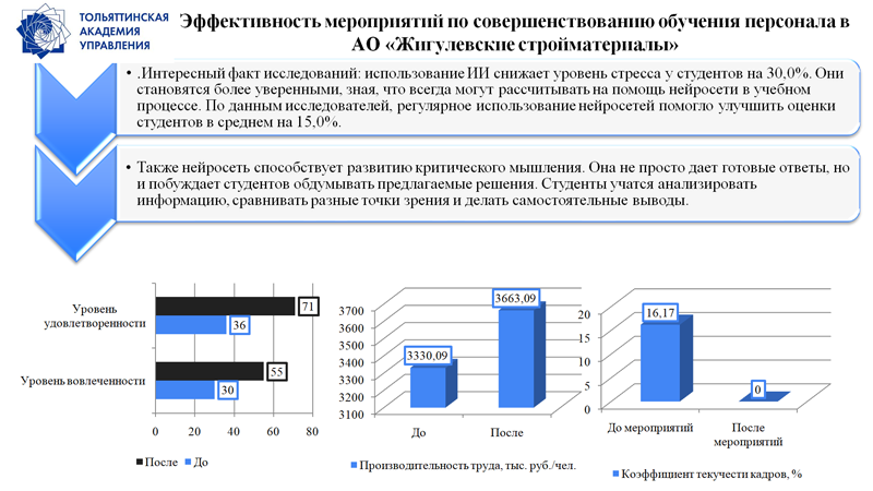 Представленный анализ оценки системы обучения в АО «Жигулевские стройматериалы», показал слабые места, ими являются: обучение осуществляется только с помощью сторонних организаций, не развивается корпоративное обучение (отсутствует корпоративный учебный пункт); не осуществляется обучение по вакансиям, связанные с развитием цифровизации, роботизации и искусственного интеллекта в строительной отрасли; при обучении не применяется искусственный интеллект, чат-боты; оценка системы обучения осуществляется в ручную, без применения специальных программ и искусственного интеллекта; для получения обратной связи применяются устаревшие методы (бумажные опросы), не используются чат-боты и искусственный интеллект; отсутствует система наставничества, не анализируются причины увольнений.