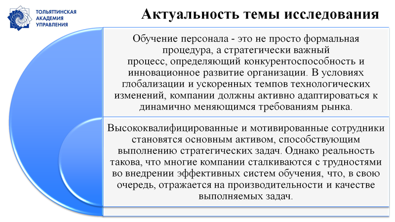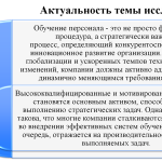 Обучение персонала – это не просто формальная процедура, а стратегически важный процесс, определяющий конкурентоспособность и инновационное развитие организации. В условиях глобализации и ускоренных темпов технологических изменений, компании должны активно адаптироваться к динамично меняющимся требованиям рынка. Высококвалифицированные и мотивированные сотрудники становятся основным активом, способствующим выполнению стратегических задач. Однако реальность такова, что многие компании сталкиваются с трудностями во внедрении эффективных систем обучения, что, в свою очередь, отражается на производительности и качестве выполняемых задач. Актуальность данной темы обусловлена необходимостью исследования теоретических и практических аспектов формирования системы обучения. Важно определить, как внутренние процессы будут интегрированы в контекст общей кадровой политики акционерного общества и как это улучшит результаты работы в целом.