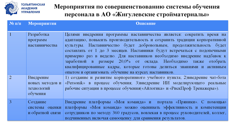 Мероприятия по совершенствованию системы обучения персонала в АО «Жигулевские стройматериалы» (слайд 7)