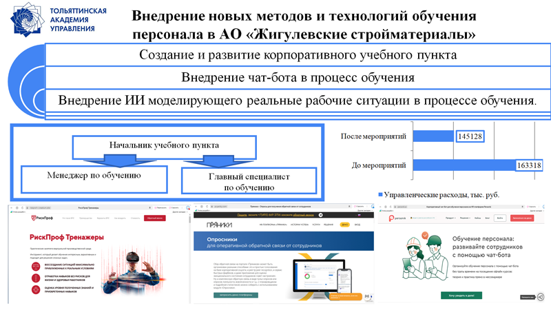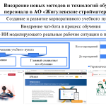Внедрение новых методов и технологий обучения направлено на реализацию следующих мер: 1) создание и развитие корпоративного учебного пункта; 2)внедрение чат-бота в процесс обучения; 3)внедрение ИИ моделирующего реальные рабочие ситуации в процессе обучения.