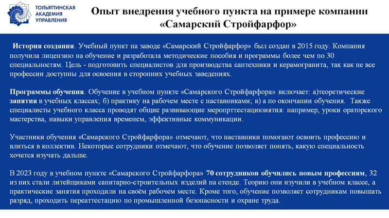 Для создания и развития корпоративного учебного пункта в АО «Жигулевские стройматериалы» был изучен опыт внедрения учебного пункта на примере компании «Самарский Стройфарфор», который показывает, как предприятие может самостоятельно организовать обучение сотрудников, повысить квалификацию или освоить новую специальность.