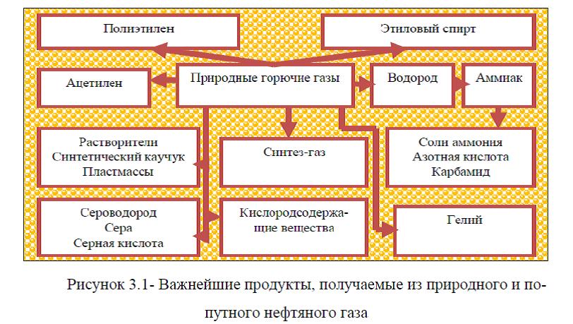 Система управления природопользованием и охраной окружающей среды компанией ПАО «Лукойл» показала, что в настоящее время разработана и действует программа экологической безопасности, которая включает в себя множество мероприятий. Однако, одной из важнейших задач группы «ЛУКОЙЛ» является повышение полезного использования и утилизации попутного нефтяного газа (ПНГ). Специфические особенности попутного нефтяного газа и его виды более подробно представлены в Приложении Д. Важнейшие продукты, получаемые из природного и попутного нефтяного газа представлены на рисунке 3.1.
