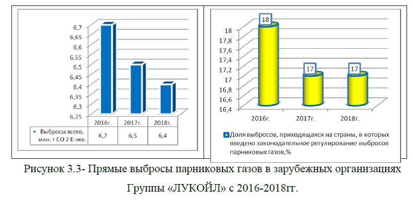 Прямые выбросы парниковых газов в зарубежных организациях Группы «ЛУКОЙЛ» с 2016-2018гг. также имеют тенденцию к снижению, в 2018г. доля выбросов, приходящаяся на страны, в которых введено законодательное регулирование выбросов парниковых газов составило 6,4 млн. т СО 2 Еэкв., а это на 0,1 млн. т СО 2 Еэкв. ниже уровня прошлого года и на 0,3 млн. т СО 2 Еэкв. ниже показателя начала анализируемого периода. Выбросы всего колеблятся на протяжении анализируемого периода в пределах 18,0-17,0%, рисунок 3.3.