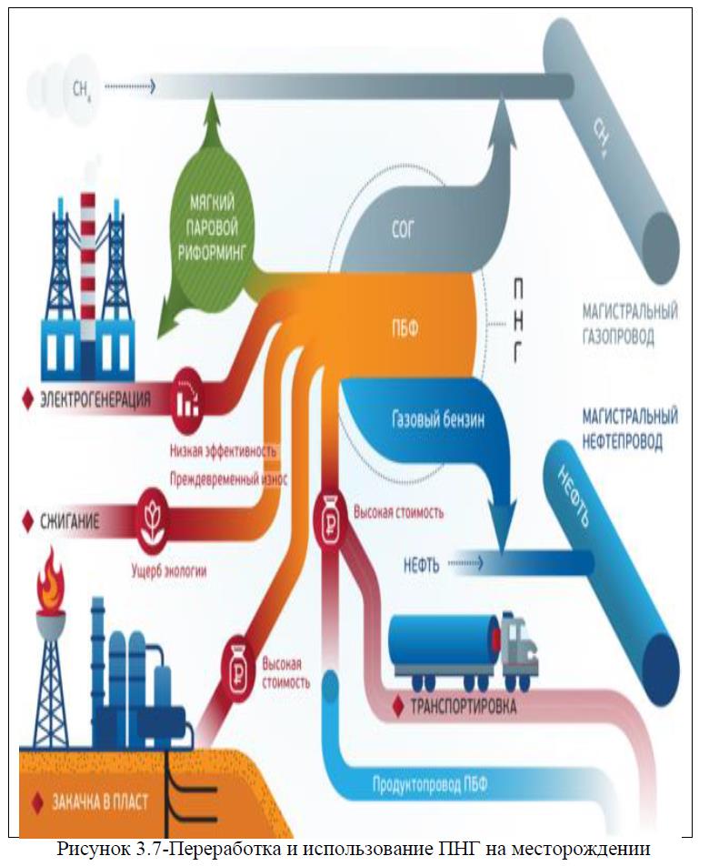 В связи с тем, что сжигание ПНГ в факелах, является не только нерентабельной, но и приводит к негативным последствиям(концентрация продуктов горения в атмосфере влечет за собой значительное ухудшение здоровья населения), является целесообразным рассмотреть другие способы переработки попутного нефтяного газа, рисунок 3.7. К ним относятся: закачка ПНГ в пласт, фракционный способ, установка энергоблоков и другие. Более подробно характеристика основных способов переработки попутного нефтяного газа представлена в Приложении Ж.
